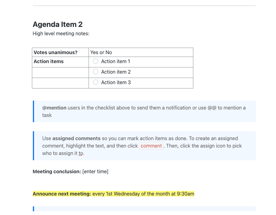 Reoccurring project management meetings repeatedly happen throughout a project. For example, while developing a new feature, the engineering team will generally meet regularly to check in. In these meeting threads, one of the best practices is to use a template for recurring meeting notes.
