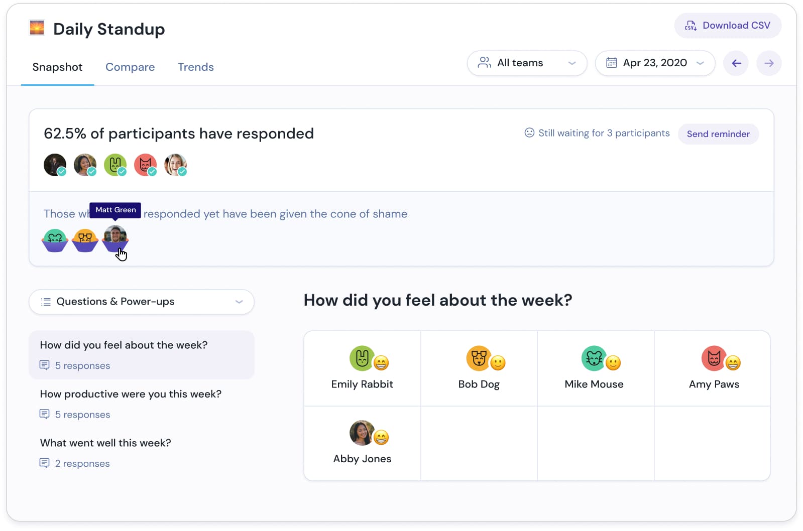Friday offers team updates and automated work routines to provide CEO updates, daily standups, or personal reflection questions all in an asynchronous communication format. You also get reports about responses, and can see individual answers. Use different team settings for private or sharing team-wide.